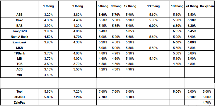 ☑️ Tài khoản tiết kiệm không kỳ hạn của ngân hàng thực tế rất thấp. Gần đây có Techcombank và VIB đều có chức năng Super Account, tuy nhiên lãi thấp chỉ khoảng 3.5%, và hạn mức để chuyển sang từ tài khoản thanh toán khá cao: Tài khoản thanh toán tối thiểu 10 triệu đồng, phần dư ra mới được chuyển sang tài khoản tiết kiệm. Với lý do này, mình không ưu tiên ngân hàng, mà tận dụng triệt để các app trả lãi theo ngày: Ví điện tử: ZaloPay (4.7%), MoMo (4%), App đầu tư: Infina (4.9%), Topi (5%) và 3Gang (5%). Các app này bản thân mình đã dùng mấy năm, và đánh giá là khá an toàn để sử dụng.